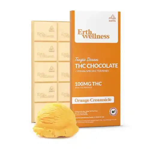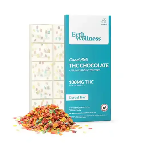 Each Erth Wellness THC chocolate bar is divided into 10 individually scored squares delivering 10mg of hemp-derived Delta-9 THC per piece — 100mg total per bar. The scored format makes dose control straightforward: start with half a square (5mg) if you’re new to edibles, or take a full square (10mg) for a standard session. Three of the six available variants are infused with live resin — terpenes captured from fresh-frozen plant material at peak potency — which preserves a fuller cannabinoid and aromatic profile than standard terpene infusions; the Milk Chocolate (Durban Haze), Dark Chocolate (Granddaddy Purple), and Strawberry Swirl (Wedding Cake) bars use this method. The remaining three — Cereal Bar (Cereal Milk), Chocolate Mint (Girl Scout Cookies), and Orange Creamsicle (Tangie Dream) — use strain-specific terpene formulations that closely mirror each target strain’s flavor and effect character. The Milk Chocolate / Durban Haze bar specifically features primary terpenes Terpinolene, Myrcene, and Ocimene — the sativa terpene profile associated with energizing, uplifting, and focus-oriented effects. All bars are made in the USA, vegan, gluten-free, non-GMO, and low-sugar.