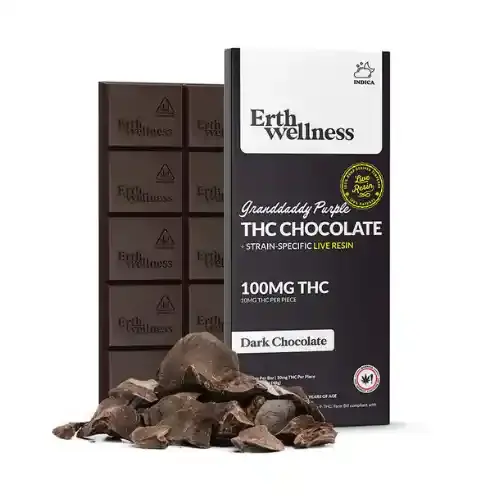 The Erth Wellness Delta-9 THC Chocolate Bar is a hemp-derived edible infused with strain-specific terpenes, available in six flavors across sativa, indica, and hybrid profiles. Each bar contains 100mg of Delta-9 THC split across 10 individually scored squares at 10mg each, making it easy to control your dose whether you’re new to edibles or an experienced user. Three of the six variants use live resin extraction; the other three use strain-specific terpene formulations — the flavor selector specifies which is which. For adults 21+. Available in-store at D8 Austin (9231 W Parmer Ln UNIT 102, Austin, TX 78717) and shipped nationwide to most states.