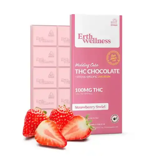 - Strawberry Swirl (100mg) — Wedding Cake (Hybrid) — Live Resin: Sweet strawberry chocolate with a dessert-forward profile drawn from Wedding Cake’s vanilla-and-earth terpene signature. The hybrid classification makes this a versatile choice — balanced between body and head effect, not strongly sedating, not strongly stimulating — and one of the most approachable options for users unsure whether to go indica or sativa.